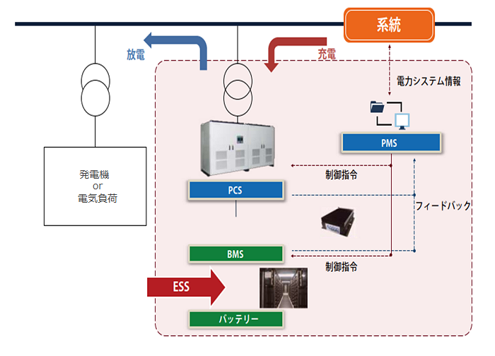 | 役割 | - PMS:バッテリー、PCS状態監視、PCS、ESSの制御 - PCS:交流-直流(AC-DC)、電力品質制御 - BMS:バッテリー監視、電力充電および放電 - バッテリー:DC状態で充電および放電 |
